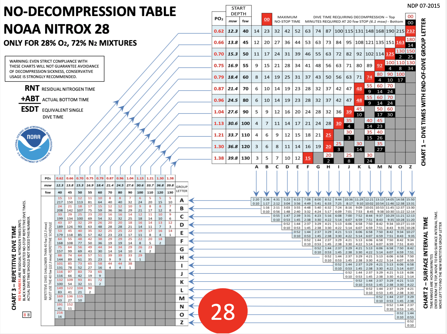Nitroxtabeller:Der findes mange forskellig tabeller til brug ved Nitrox dykning. Nogle tabeller er for forkellige blander af Nitrox, andre er sammenlignings tabeller hvis man dykker med ""almindelig"" luft. (21% O2) - 1 - NOAA Ikke-Decompressios Tabeller for Nitrox Dyk:NOAA's 'maksimale oxygenpartieltryk (PO2) er 1,4 ATA for ikke-dekompressionsdyk.Der er 13 tabeller inkluderet i PDF filen, en for hver procentdel mellem 28 og 40%. Disse tabeller inkluderer PO2-niveauer for hver dybde og PO2-værdier op til 1,6. Dog er alle dybder, hvor PO2-niveauer overstiger 1,4, fremhævet med gult og skal undgås til planlægningsformål. De er kun inkluderet i tilfælde af, at en dykker overstiger den planlagte maksimale dybde. Derudover er der fire tabeller med dykkeplaner fremhævet i orange (37-40%). Disse dyk overskrider den maksimale PO2-enkelteksponeringsgrænse og bør undgås. Det partielle tryk på ilt ved dybden er den dybdebegrænsende faktor for enhver nitrox-blanding. En vigtig facet i nitrox-dykplanlægning er at optimere iltniveauet ved at fortrænge så meget nitrogen som muligt, mens det forbliver inden for ilteksponeringsgrænserne (NOAA Diving Manual, 4. udgave, s. 15-4). For yderligere gennemgang af nitrox-dykning henvises til kapitel 15 i NOAA Diving Manual, 4. udgave. Hele NOAA's tabel kan downlodes her